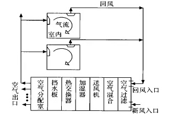 圖1所示的是某酒店中央空調的示意圖:空氣從回風口和新風口進入空調系統入口,入口處設調風門以控制進風量的大小,過濾后的空氣繼續往前,到空氣混合室,通過送風機后,被送去加濕,加濕后的空氣送去冷卻或加溫(隨季節而定),經擋水板,然后,進入空氣分配室,再到送風管,最后進入空調室。