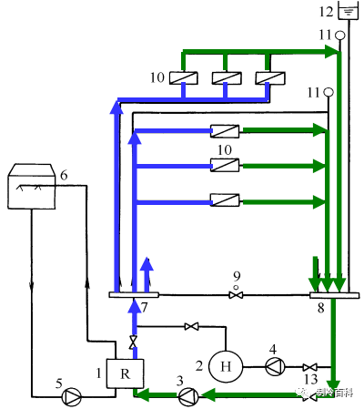 夏季供冷時 :下圖所示,冷水機(jī)組1制出的7℃冷凍水,在冷凍水泵3的作用下送至分水器7,然后由分水器通過各供水支管分別送至各空調(diào)房間或區(qū)域的空調(diào)設(shè)備10。