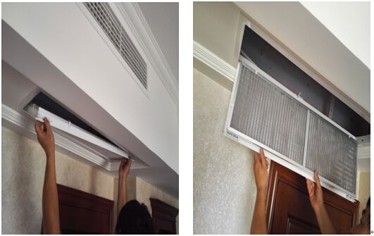 從出風(fēng)口和回風(fēng)口處取下的過濾網(wǎng),要用水沖洗至潔凈,可用小刷子搭配清潔劑仔細(xì)清潔。將清洗好的過濾網(wǎng)放在背光處晾干,然后將過濾網(wǎng)重新裝回出風(fēng)口,面板在吊頂上固定好,恢復(fù)風(fēng)口原狀。